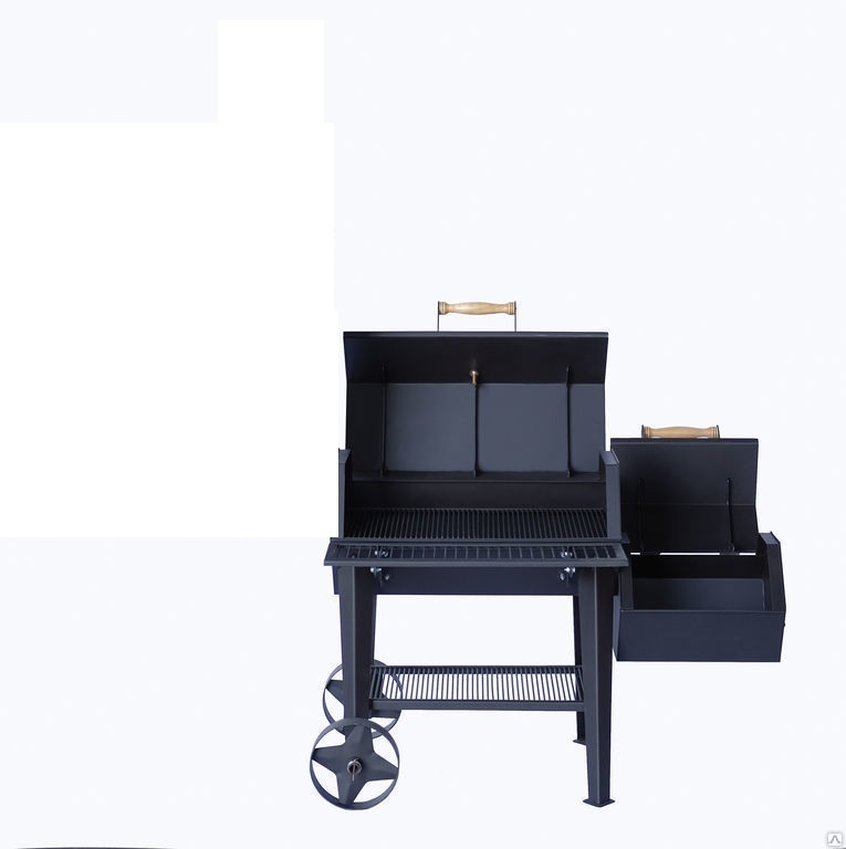 3.Горизонтальная камера в форме бочки (габариты 800x500 мм) – рабочая зона для барбекю, гриля и горячего копчения. Оборудована крышкой, открывающей внутреннюю полость по всей длине. А также решетками из нержавеющей пищевой стали и: внутренней и наружной (прикреплена/приварена сбоку корпуса).