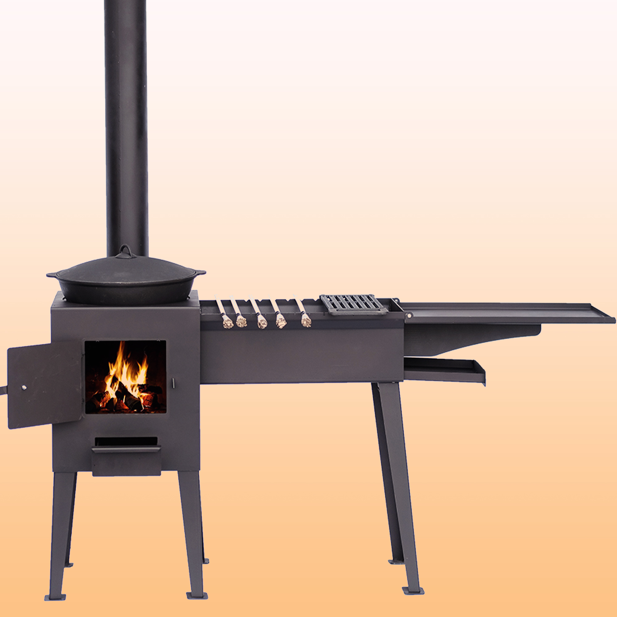 Металлический мангал отлично впишется не только на даче, но и в загородном доме, и может использоваться в качестве летней кухни, благодаря стальной конфорке казана можно с легкостью вскипятить чайник или приготовить любое блюдо, как на дровяной печи с варочной панелью.