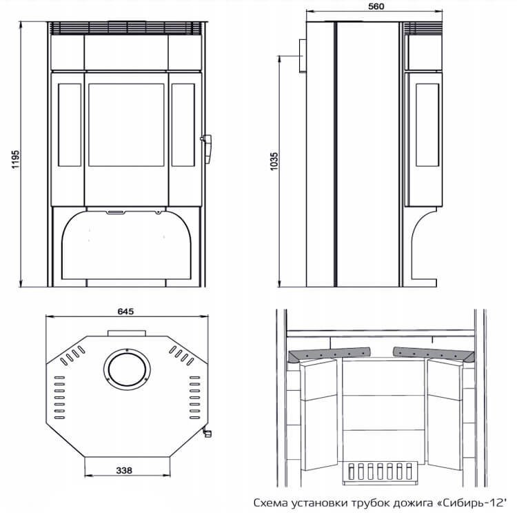 В конструкцию печи-камина "Сибирь" - 12 кВт внедрена доработанная система дожига вторичных газов, позволяющая увеличить КПД камина и скорость нагрева отапливаемого помещения.
