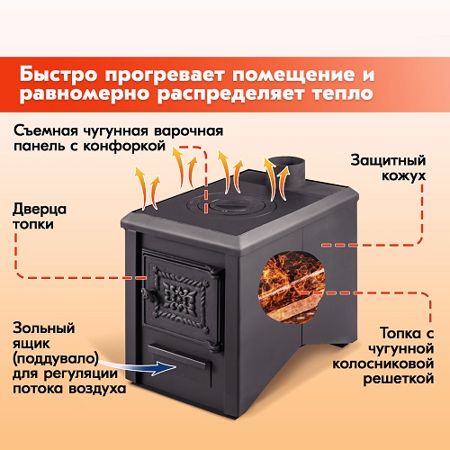 Воздушные потоки, входящие через зольник и чугунную колосниковую решетку, обеспечивают необходимый для горения топлива кислород.