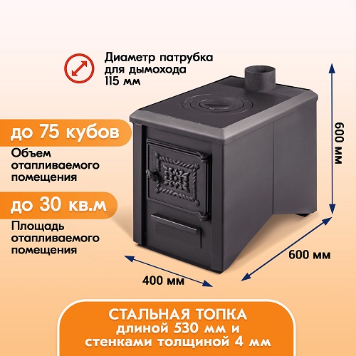 Конструкционные особенности печки позволяют использовать в качестве топлива дрова. Рекомендуемая длина дров до 530 мм.