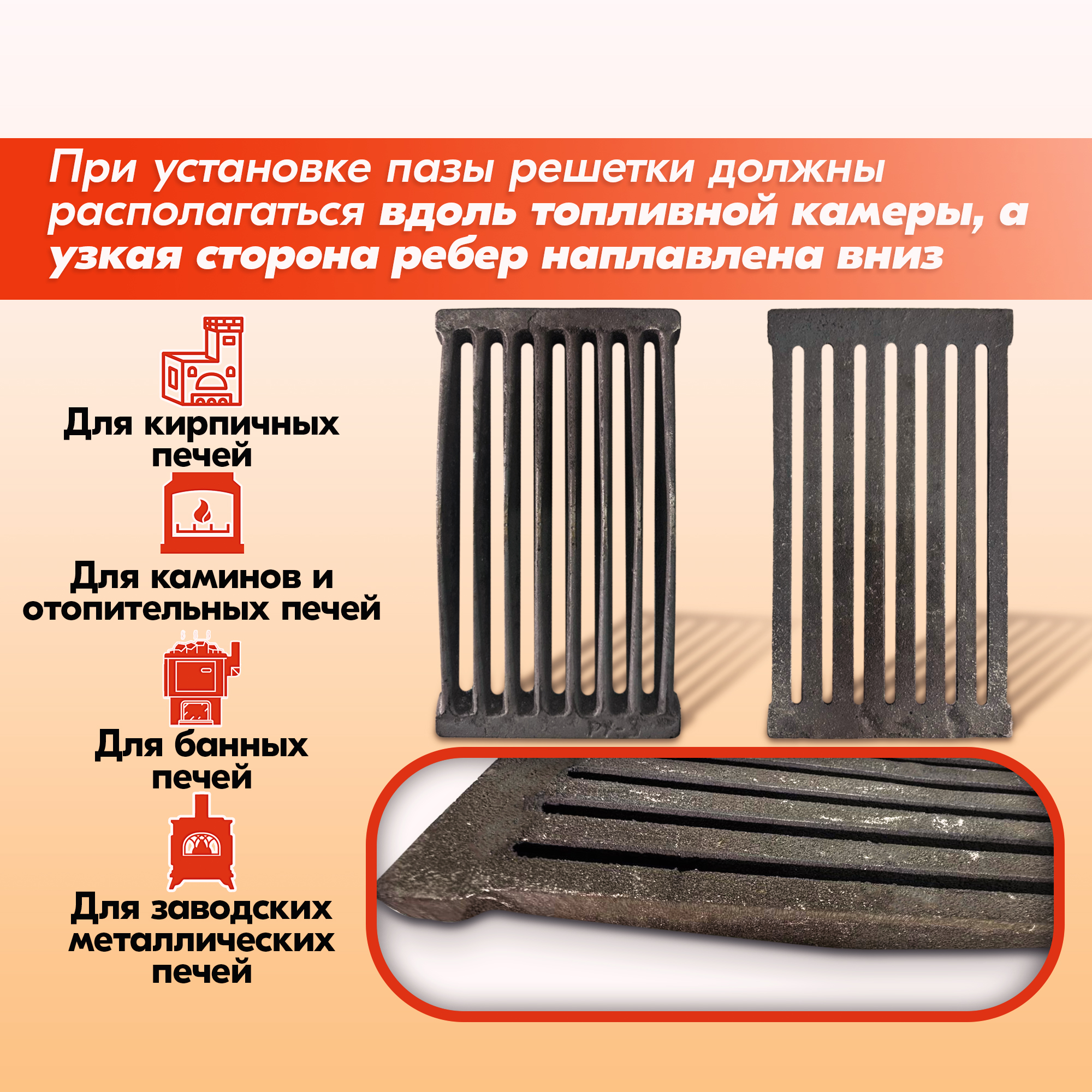 Обращаем внимание, что колосниковая решетка из чугуна РУ-7 — это 1/2 колосниковой решетки для угля РУ-2 и предназначена для укладки с решеткой РУ-2 в увеличенные по ширине топки печей размером 300х300 мм и больше.